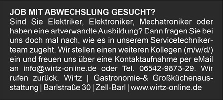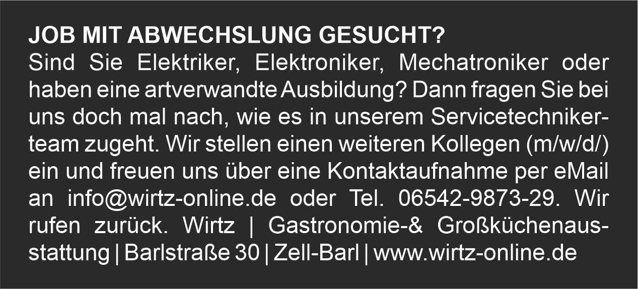 Im Moment sind wir komplett. Dennoch können wir bei Interesse, z.B. Servicetechniker, Außendienst oder Ausbildung, vertraulich über alles sprechen. Tel. Jürgen Wirtz 06542 9873 29 oder Tel. Peter Wirtz 06542 9873 27.