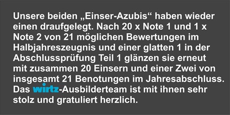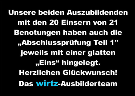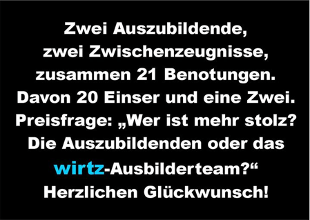 SO MACHT AUSBILDUNG SPASS. Wir alle von Wirtz freuen uns über die tollen Noten. Wirtz GmbH | Gastronomie-& Großküchenausstattung | Barlstr. 30 | 56856 Zell (Mosel) | Tel. 06542 9873 0 | eMail info@wirtz-online.de