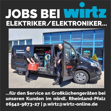 Im Moment sind wir komplett. Dennoch können wir bei Interesse, z.B. Servicetechniker, Außendienst oder Ausbildung, vertraulich über alles sprechen. Tel. Jürgen Wirtz 06542 9873 29 oder Tel. Peter Wirtz 06542 9873 27.