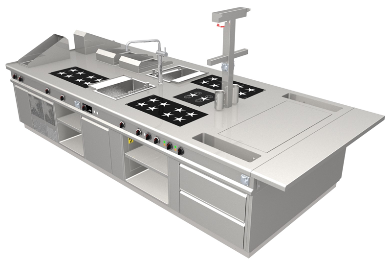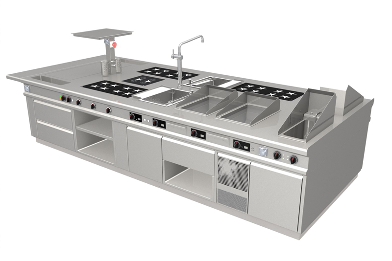 Salatküche und Patisserie gehen ineinander über. Dieser komplette Bereich ist mit einer einzigen fugenfreien Platte mit Hygienestecknaht nach Maß abgedeckt. Alle Kühlmöbel werden zentral gekühlt.
