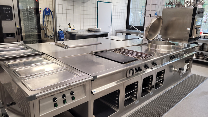 GEMEINSCHAFTSVERPFLEGUNG. Der hygienisch gestaltete Kochbereich in einer Heimküche. Oben fugenlose dichte Abdeckung. GastroNorm-Unterbauten in H3-Hygieneausführung.